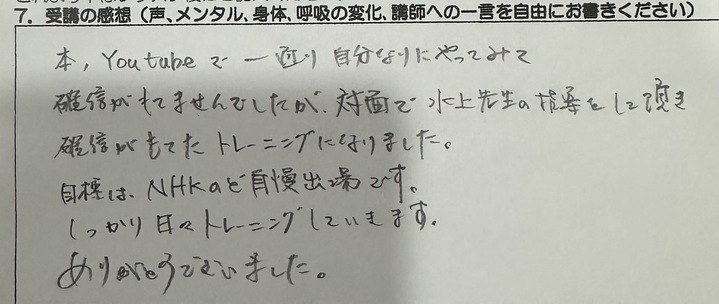 自分の新たな声が発見できました。声の出し方に加え、メンタルについてのアドバイスが今後の自分にとってとても参考になりました。思い切って 1 歩踏み出してよかった。これからは今日学んだことを実践していこうと思います。
