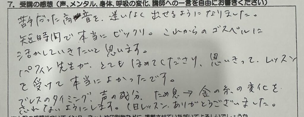 今までは高音を出そうとすると、のどが痛くなったり、かすれた音しか出なかったのが、今回のレッスンのおかげで、のどに痛みがなくしっかりと高音が出せるようになったので、うれしかったです。声の出し方だけではなく、メンタルについてもお話が聞けて、メンタルを整えることの大切さを初めて知りました。